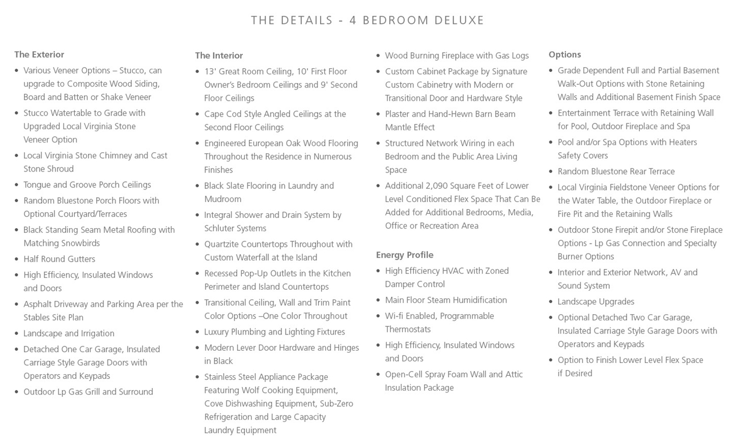 The unique home plans positioned across sprawling estate homesites of approximately 1.3 acres are available at The Stables. Ranging from 3,850 to 4,750 square-feet, every home in The Stables is elegantly appointed with European Oak flooring with custom finish, Quartzite countertops, designer tiling, high ceilings, expansive windows, and a master chef’s appliance suite. Customizable options are available with each layout to showcase your personal tastes. Each layout provides an ample courtyard space with upgrades available including a bluestone terrace, summer kitchen, swimming pool, and a stone or stucco fireplace or firepit.