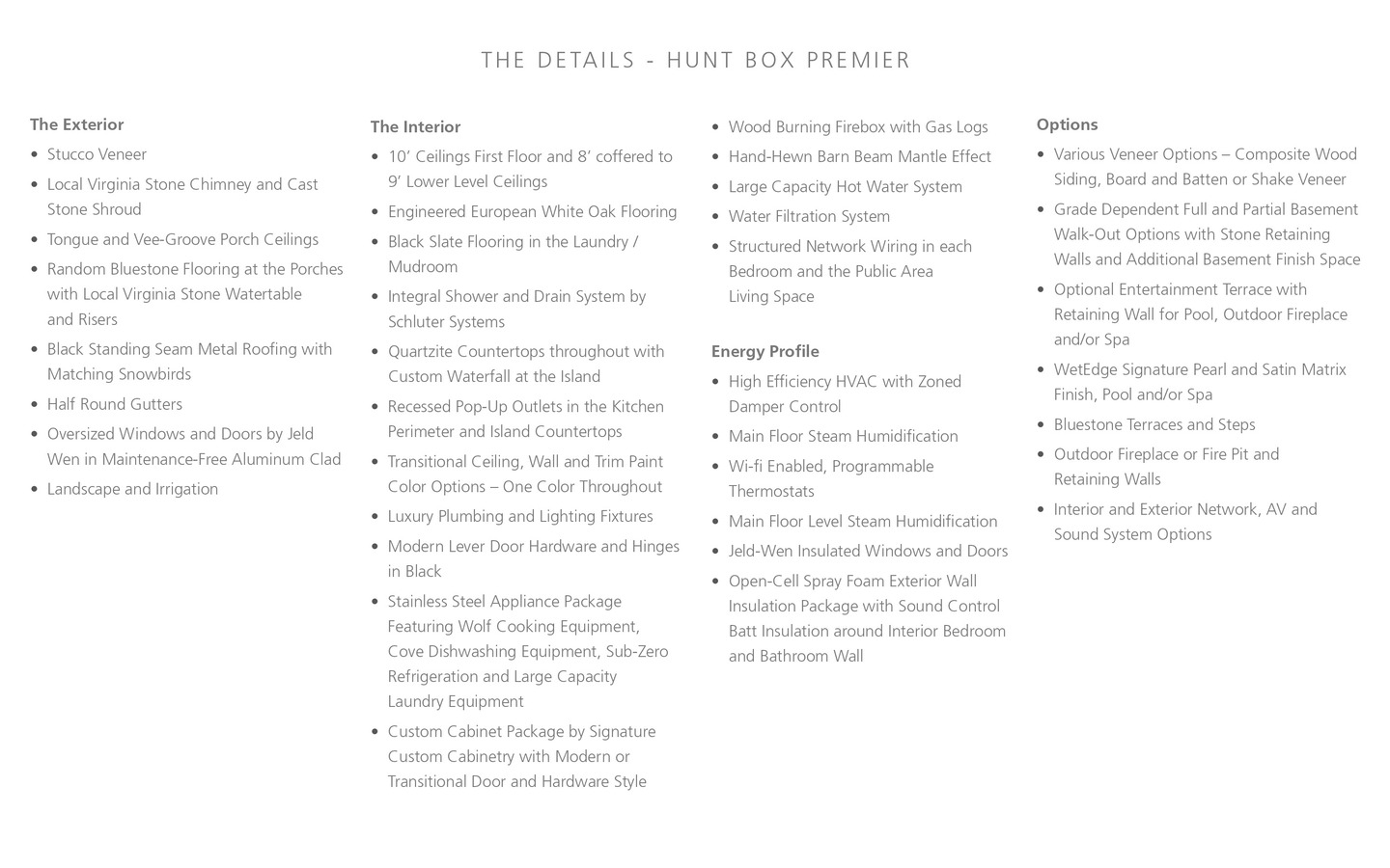 Our Hunt Box Premier home plan offers approximately 2,500 square feet on the main floor and 5,000 square feet overall combining sophistication with ease and elegance. The home design features a commanding great room encompassing the entertaining, dining, and kitchen areas, along with gracious outdoor living spaces. The home offers the flexibility of accommodating 2-5 bedrooms, depending on your vision as well as how much space you prefer. The lower level offers ample bedroom suites for family and guests along with versatile recreational areas that can be customized into a home gym, media room, office, or game room. Options and customizations abound with this premier home plan.